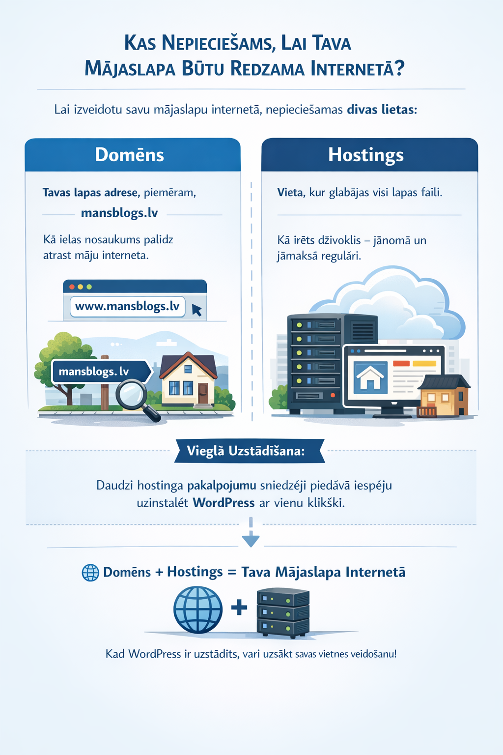 Domēns + Hostings = Mājaslapa internetā