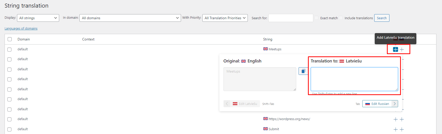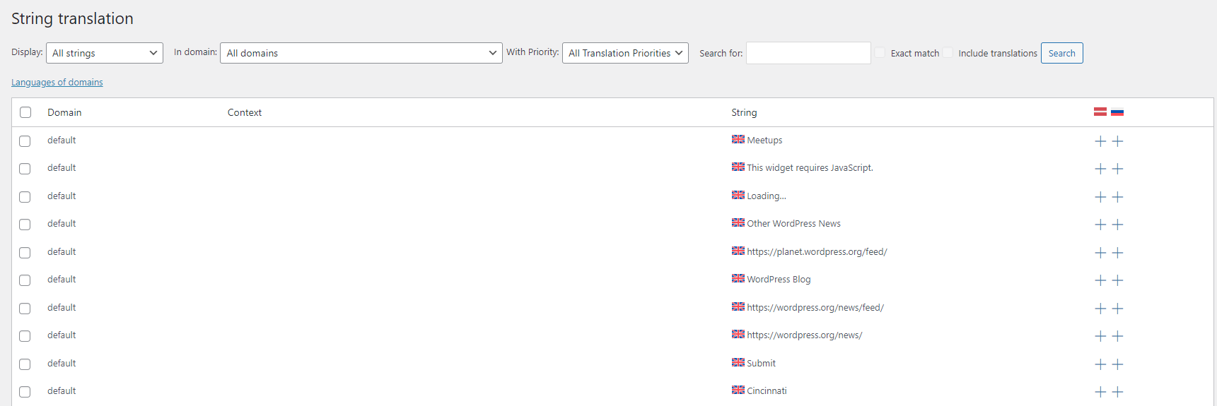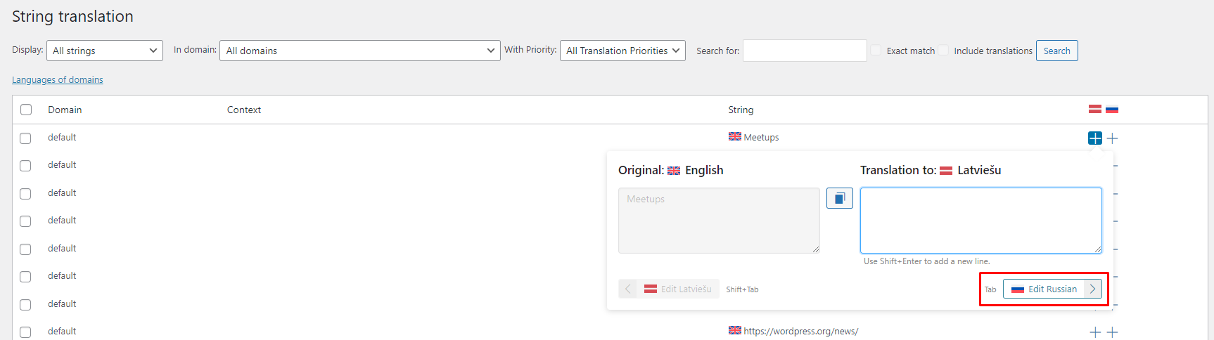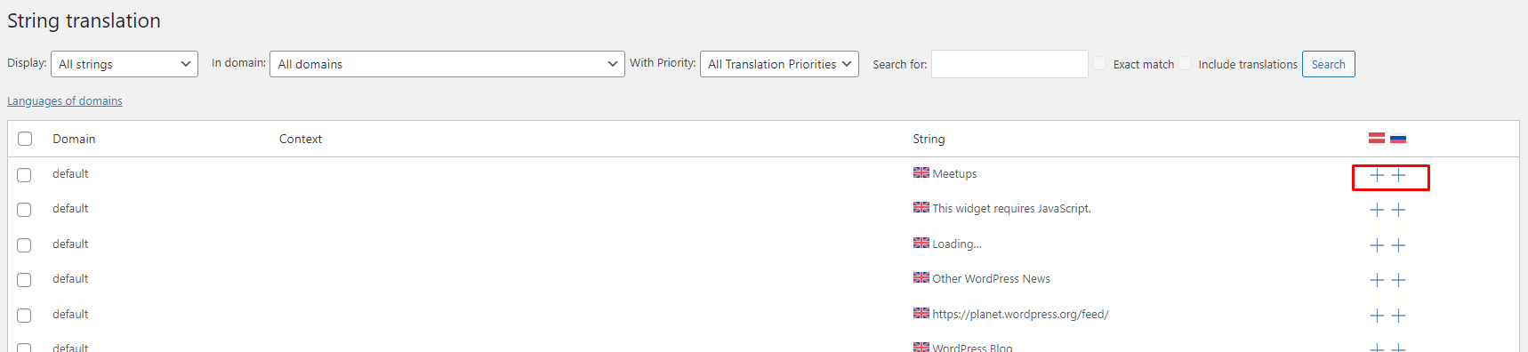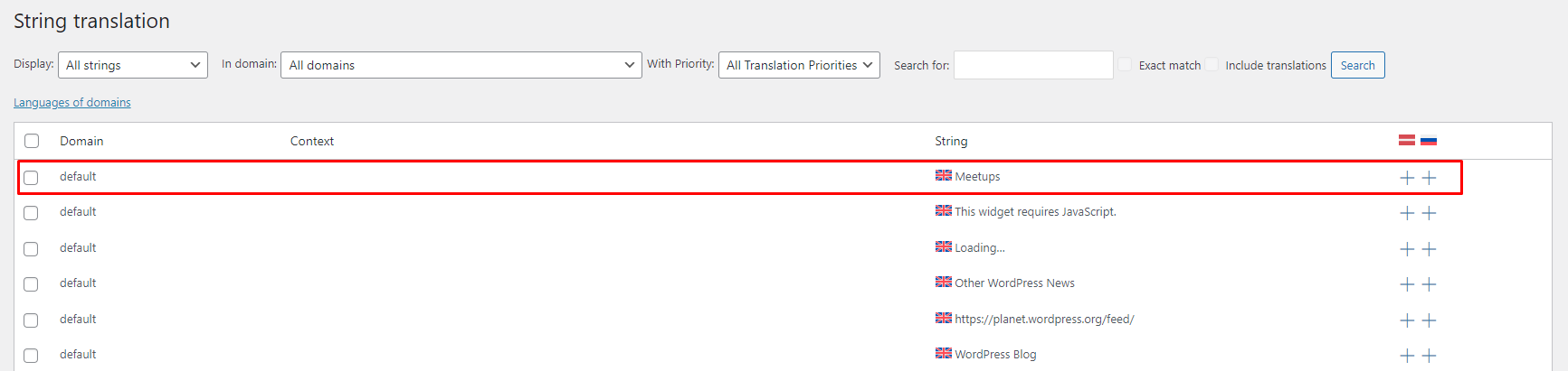 2. WPML String Translation sadaļā Jums vajadzētu atrast visus tekstus, kas ir pieejami tulkošanai. Tas var ietvert tekstu no tēmām, spraudņiem un citiem elementiem, kuri tiek izmantoti Jūsu vietnē.
