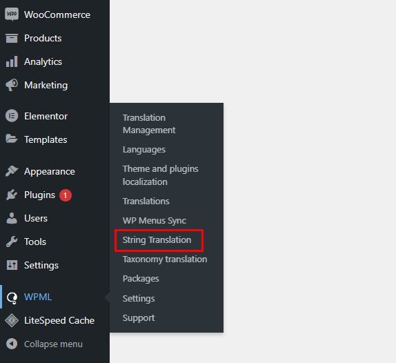 1. Atveriet WordPress administrācijas paneli un dodieties WPML > String Translation.